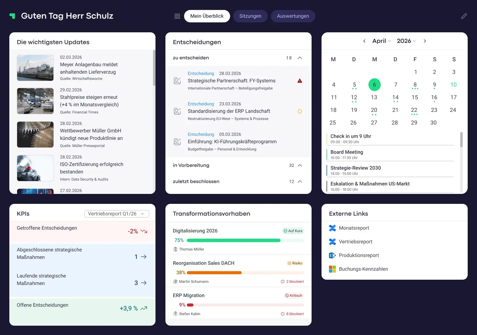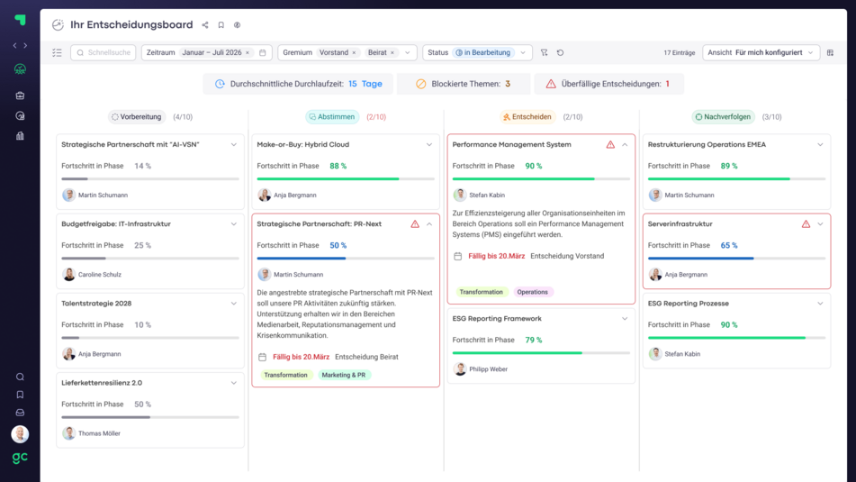 - Jederzeitige Transparenz über den Status von Beschlussvorlagen, Meetings und Maßnahmen durch Dokumentation