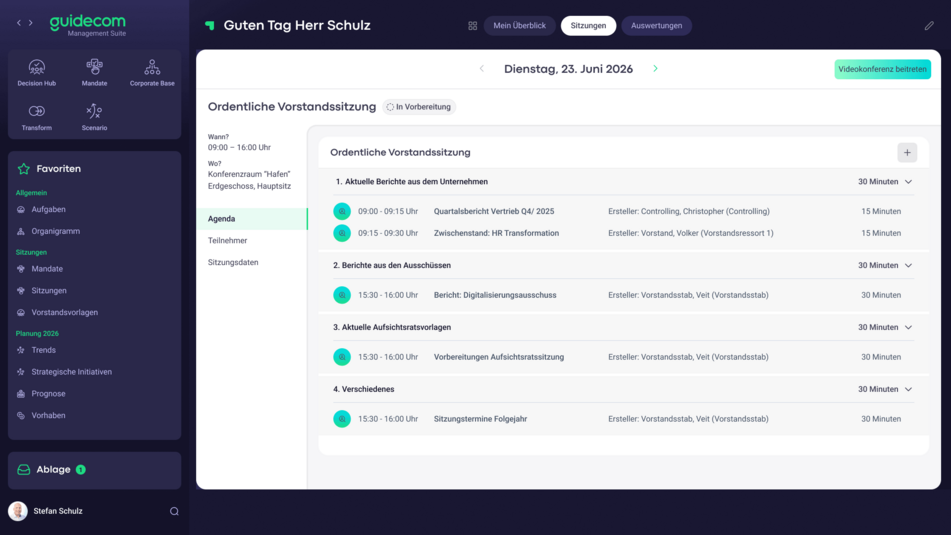 GuideCom Decision Hub ist speziell für Vorstände, Gremien und Organisationen entwickelt, die ihr Sitzungs- und Entscheidungsmanagement zukunftsfähig gestalten möchten. Zu unseren Kunden zählen neben Banken und Sparkassen, auch Unternehmen verschiedener Größenordnungen und Branchen.