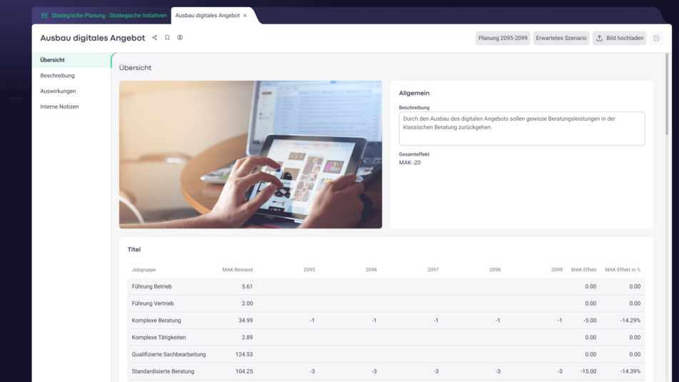 Die strategischen Initiativen können konkret und einfach festgehalten werden, wodurch die Gesamteffekte sichtbar werden und sich direkt auf die jeweiligen Jobgruppen ableiten lassen. Gleichzeitig erfolgt eine Staffelung der Kapazitätseffekte auf die Folgejahre.