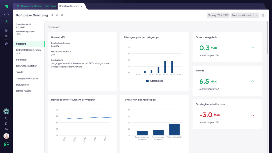 Die Bestandsentwicklung kann auf Jobgruppenlevel sofort ausgewertet werden, wobei unterschiedliche Szenarien einfach festgelegt und relevante Trends sowie strategische Initiativen direkt berücksichtigt werden. Daraus lassen sich zutreffende Maßnahmen ableiten.